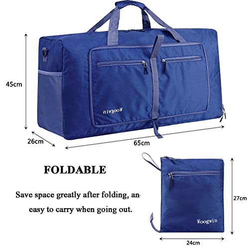 Extra large capacity & foldable: The 65x45x26cm(25”x17”x10”) large compacity duffle bag will serve you well as a carry on luggage bag, gym bag, travel laundry bag. It also can be conveniently folded to a 27x24cm(10.6”x9.8”) small bag with zipped pocket on each side, make it easy to storage and carry on.